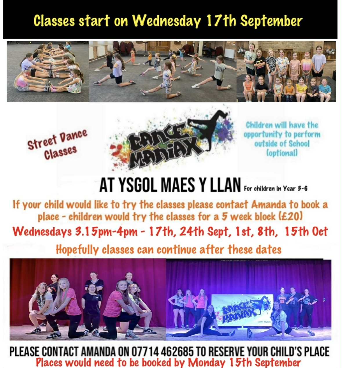 Please see attached the information about Street Dance classes which could be held in our school hall if required. The sessions are for children in KS2 (years 3 to 6) and will be held every Wednesday from 3:15pm until 4pm. To book the sessions please contact Amanda directly.
